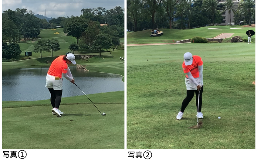 ゴルフのスイングは要はインパクトでこの形ができれば良いショット或いはそこそこのショットに落ち着くようになっています。先日米国LPGAツアーを観戦し選手達のスイング動画を撮影し分析してみました。そこにナイスショットの共通点がありましたので、写真と共に読者の皆さんと共有したいと思います。写真①は西郷真央選手が16番ホールのティショットで3番ウッドを打っていいます。インパクトの瞬間に腰のライン(お臍)は目標を向いているのに肩のラインがスクエアでボール側に向いている状態。これができると遠く且つ目標方向にボールが正確に飛んで行きます。また写真②は西郷真央選手が17番ホールのセカンドショットでPWを打ったものです。これにも狙ったところにボールを飛ばせる要素がありました。それはインパクトの瞬間に左肩左腕左手シャフトクラブフェースが一直線になっていること。この写真①と②のポイントができているスイングはかなり安定しターゲットを狙えるようになってきます。この感覚を養うにはタイヤ叩きドリルがおすすめです。とにかくインパクトでこの形を意識してみるのです。どうぞお試しください。