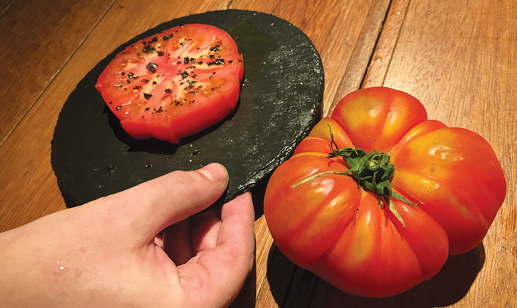 取材当日はスペインからの食材が届いたとのことで、スペイン産トマトも試食。なかなか奇抜な形ですが、炭の塩をふりかけただけでトマトの濃厚な味わいが引き立っていました!