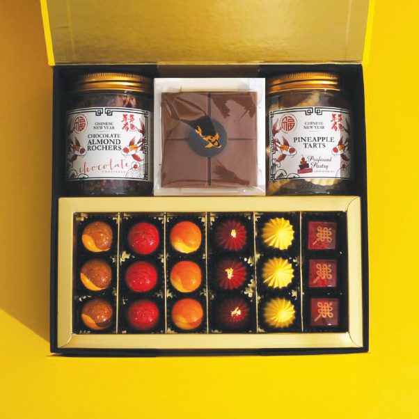 6つのフレーバーのボンボンショコラと、パイナップルタルト、アーモンドクランチなどの彩りも美しいギフトボックスです。