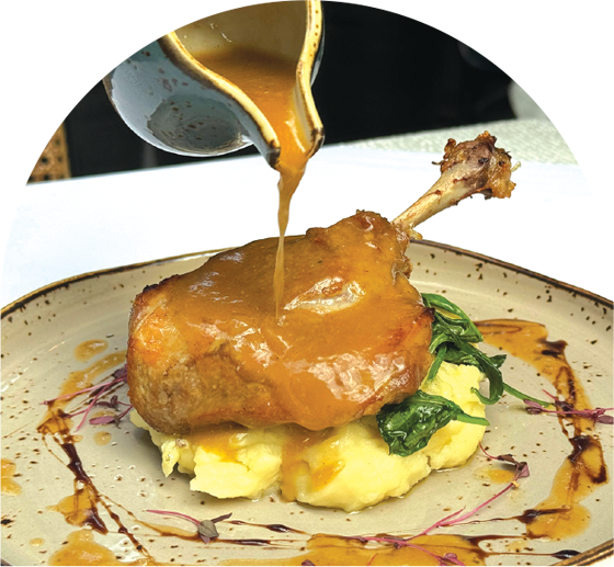 1日寝かせた鴨肉をシナモンや八角などの5つの中華スパイスでマリネし、その後16時間低温で真空調理し、仕上げにオーブンで焼いた鴨のコンフィ。鴨の骨や野菜から出汁を取った爽やかな甘みを感じるグレービーをかけてどうぞ。
