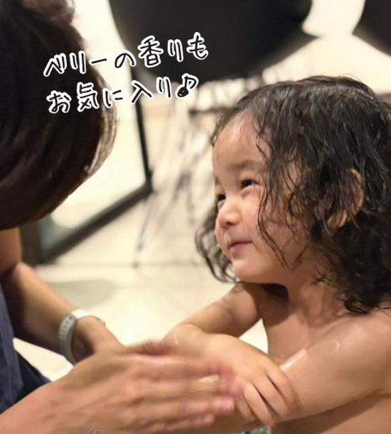 しっかりめのテクスチャーですが伸びがよく、スッと肌になじむので塗りやすいですね。しっかり保湿してくれるのにベタつかず、服を着せるときもスムーズでした。ボディウォッシュと同様に香りも心地よく、親の私もお気に入りです。