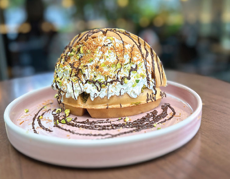 Pistachio Kunafa Chocolate Waffle RM35外はカリッと香ばしいワッフルに、ピスタチオのクナーファと生クリーム、バニラアイスをたっぷり挟んだボリューム満点の一品。ピスタチオのナッティな香りとリッチなコクが軽やかな生クリームと溶け合い贅沢な味わいを楽しめます。(オーナー メイリーさん)
