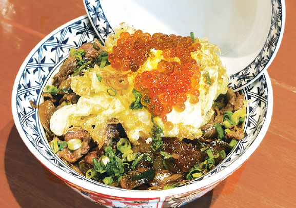 特製のすき焼き割下で煮込んだやわらかな和牛に、黄金色に揚げたサクサクの温泉卵の天ぷらがとろりと絡む特製すき焼き丼。プチっと弾けるいくらが、旨味をさらに引き立てます。