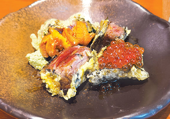 約2cmの厚みにカットした和牛を海苔で包み、天ぷらでサクッと揚げた一品。いくらや、濃厚でクリーミーな雲丹をたっぷりと添えた磯の香りが広がる、贅沢な味わい。