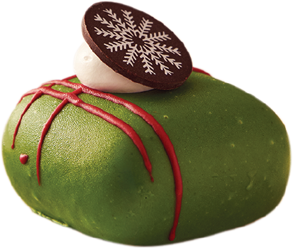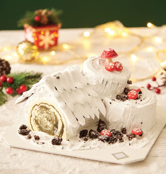 まるで御伽話に出てきそうな白い雪化粧をまとったログハウス型のチョコレートログケーキ。ふんわりとしたクリームに軽い食感のスポンジがよく合います。