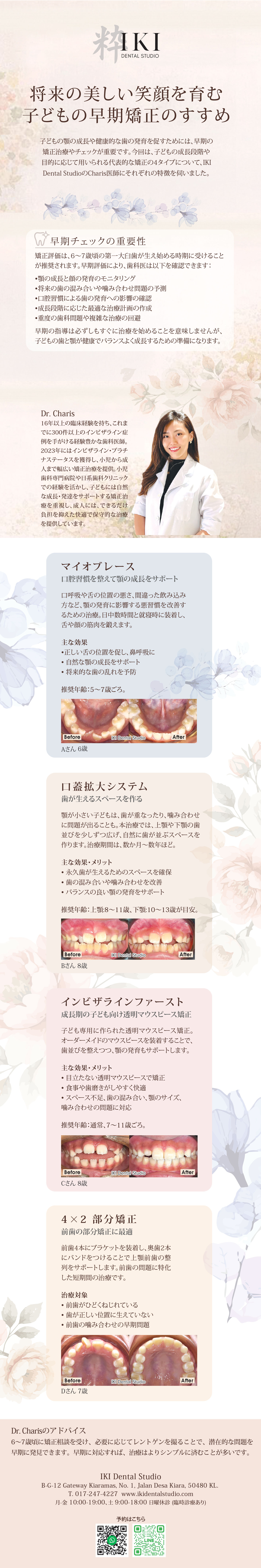 子どもの顎の成長や健康的な歯の発育を促すためには、早期の矯正治療やチェックが重要です。今回は、子どもの成長段階や目的に応じて用いられる代表的な矯正の4タイプについて、IKI Dental StudioのCharis医師にそれぞれの特徴を伺いました。