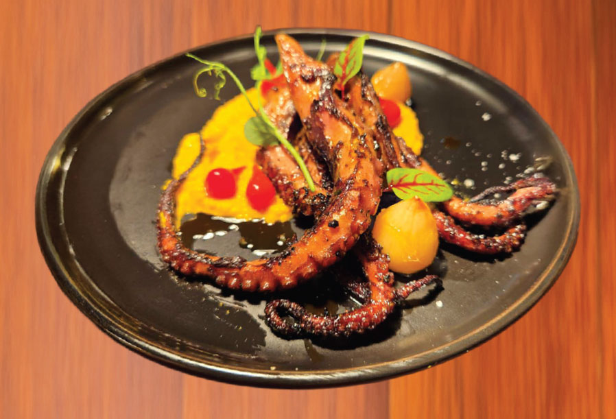 低温でじっくり煮込んだ後、炭火でグリルした地中海産タコは非常に柔らかく、しっとりとした繊細な食感。ほのかな燻製香がアクセントになります。