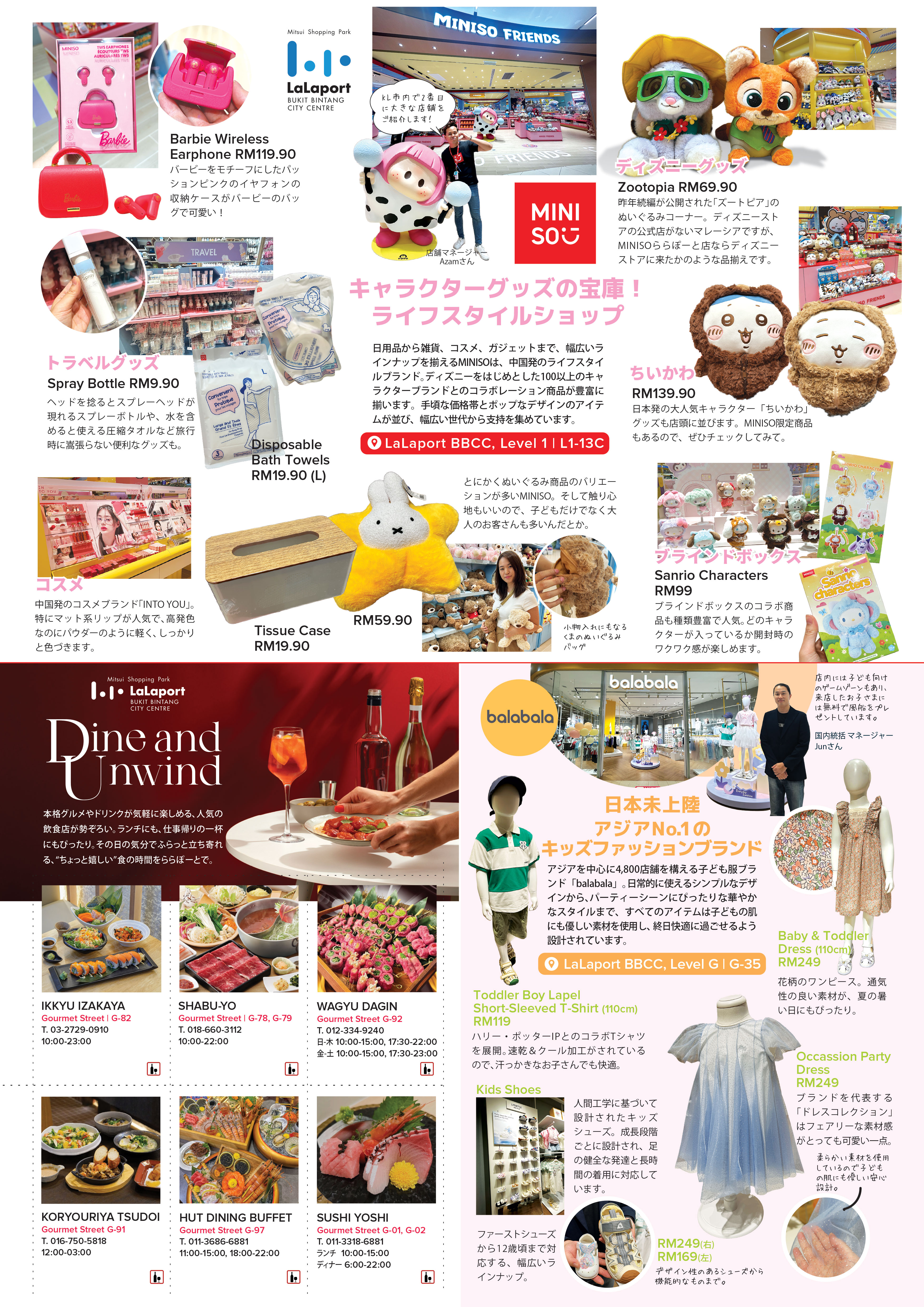 日用品から雑貨、コスメ、ガジェットまで、幅広いラインナップを揃えるMINISOは、中国発のライフスタイルブランド。ディズニーをはじめとした100以上のキャラクターブランドとのコラボレーション商品が豊富に揃います。手頃な価格帯とポップなデザインのアイテムが並び、幅広い世代から支持を集めています。• 本格グルメやドリンクが気軽に楽しめる、人気の飲食店が勢ぞろい。ランチにも、仕事帰りの一杯にもぴったり。その日の気分でふらっと立ち寄れる、“ちょっと嬉しい”食の時間をららぽーとで。• アジアを中心に4,800店舗を構える子ども服ブランド「balabala」。日常的に使えるシンプルなデザインから、パーティーシーンにぴったりな華やかなスタイルまで、すべてのアイテムは子どもの肌にも優しい素材を使用し、終日快適に過ごせるよう設計されています。