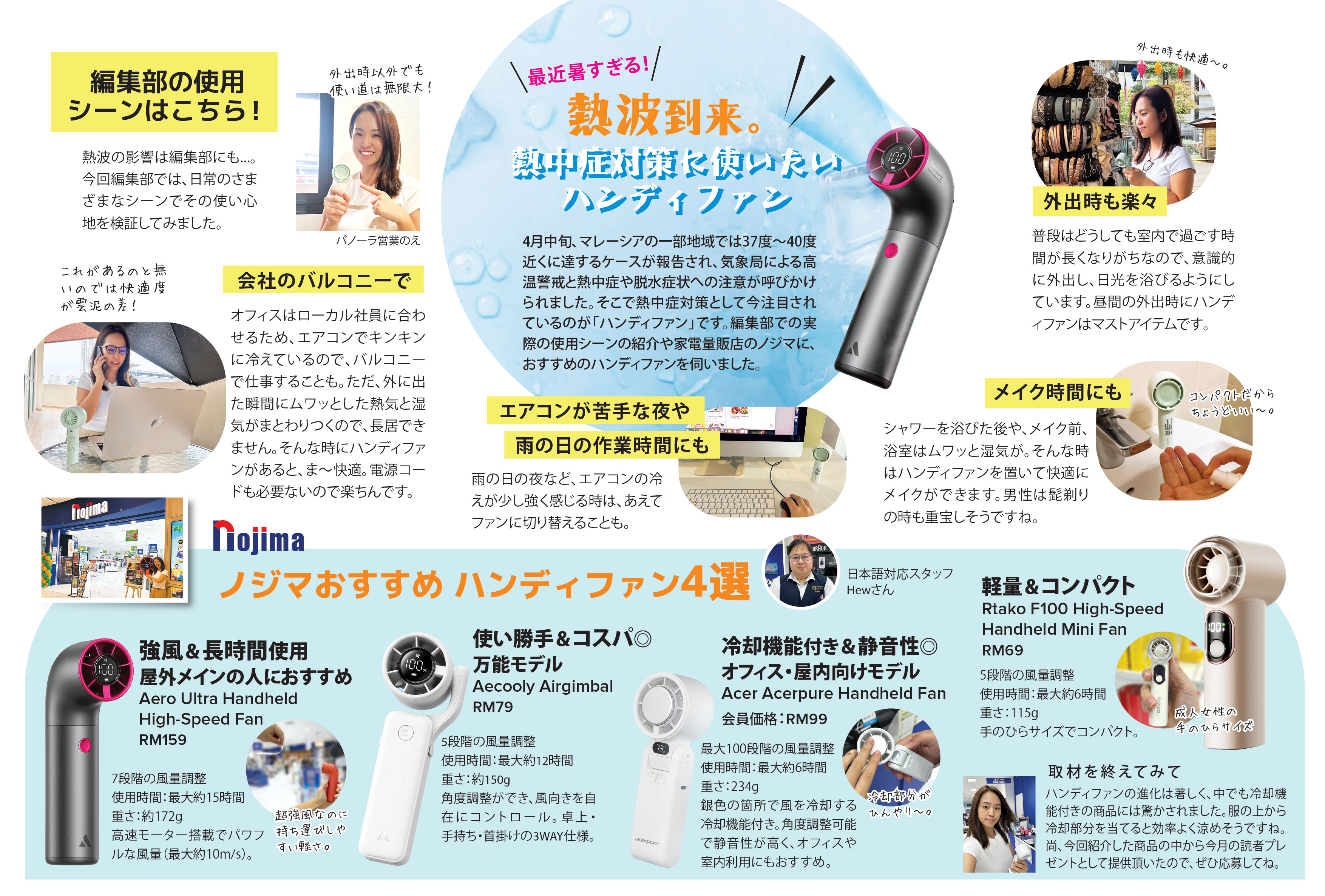 4月中旬、マレーシアの一部地域では37度〜40度近くに達するケースが報告され、気象局による高温警戒と熱中症や脱水症状への注意が呼びかけられました。そこで熱中症対策として今注目されているのが「ハンディファン」です。編集部での実際の使用シーンの紹介や家電量販店のノジマに、おすすめのハンディファンを伺いました。