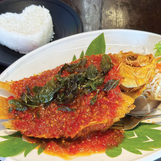 外はカリッと中はふっくら揚げた鱸。チリやパイナップルなど自然素材で仕上げた、甘味・酸味・辛味が絶妙に絡む特製ソースをたっぷりと。