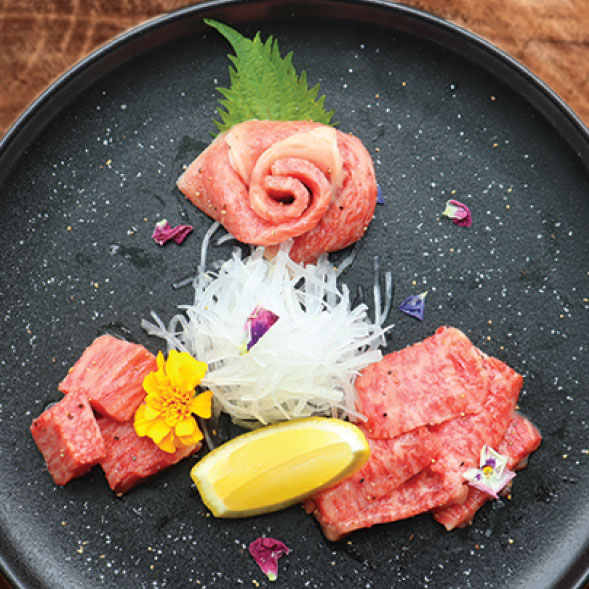 霜降りが美しく、脂がたっぷりと乗ったジューシーなタン元。食感を最高潮に愉しめる絶妙な厚さです。