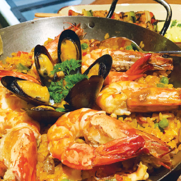 チキンやポーク、魚介の旨味がお米1粒1粒にまでしみ込んだボリューム満点のパエリア。大ぶりの海老にもご注目を!