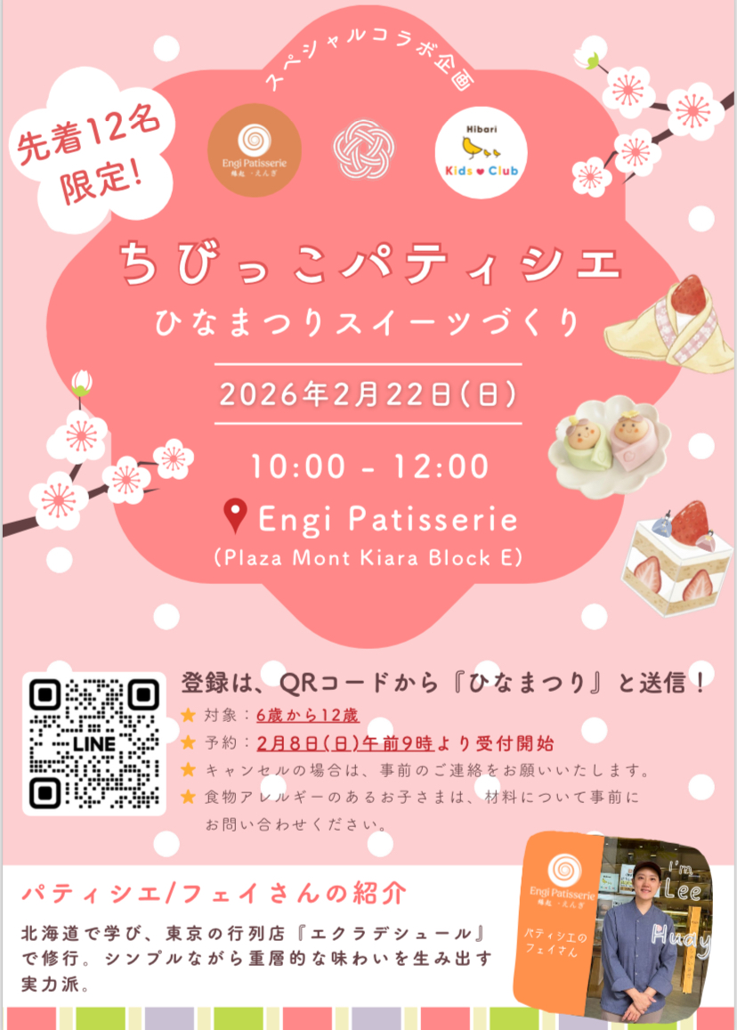 ひばりクリニック主催のひばりキッズクラブでは毎月一度、ワンモントキアラモール マレーシアの最新ニュース LATEST NEWS 2026年2月1日 【マレーシア最新ニュース】 ひばりクリニック 2月のイベント情報! <ママカフェ>2月18日(水)場所:Mr Fish (1Mont Kiara GFloor)時間:10時~12時予約不要・参加費無料・時間内出入り自由 ひばりクリニック主催のママカフェは毎月一度、ワンモントキアラモール内にあるキッズフレンドリースペースを備えた場所で開催しており、子育てに奮闘するママたちに寄り添う場として、医師が相談や質問に答えます。英語に自信のない方でも安心です。必要に応じて日本語通訳もサポートします。 <キッズクラブ>2月22日(日)「ちびっこパティシエ~ひなまつりスイーツづくり」場所:Engi Patisserie(Plaza Mont Kiara E block)時間:10時~12時要事前登録 (先着12名限定)・参加費無料 話題のパティスリー、『Engi Patisserie』とのコラボイベント!ひなまつりカラーのデコレーションやお菓子づくりに挑戦して、自分だけのオリジナルスイーツを完成させよう!※対象年齢は6歳~12歳 #マレーシア #マレーシアニュース #マレーシア現地情報 #日本語情報誌 #マレーシア #マレーシア#ハローマレーシア #パノーラ#マレーシア生活 #クアラルンプール#Panora #マレーシア#Hellomalaysia #Malaysia #KL #KualaLumpur#マレーシア情報 #マレーシアグルメ #マレーシアフリーペーパー #ひばりクリニック #モントキアラ #サークル #ママ友 #ママカフェ#育児相談 その他のニュースOTHER NEWS 生活費指標、セランゴール州のシャアラムとペタリンでKL超え 2026年1月16日 マレーシア統計局が発表した… 「ゴジラ・ストア」、ららぽーとBBCC内に1月9日オープン 2026年1月15日 東南アジア初のオフィシャルストア「ゴジラ・ストア・マレーシア」がららぽーとBBCCにオープン… 国民戦線、次期総選挙後にGST復活を目指す方針 2026年1月14日 アンワル政権と連立内閣を構成する政党連合・国民戦線(BN)は、次期総選挙後に物品・サービス税(GST)復活を目指す方針だ。… 配車サービスのインドライブ、マレーシアでの事業継続が可能に 2026年1月13日 … Read more ひばりクリニック 2月のイベント情報!